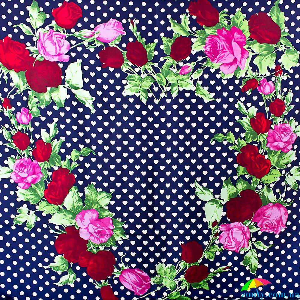 Насыщенные цвета этого женского платка сразу обращают на себя внимание своим стильным сочетанием друг с другом. Темно-синий фон делают светлее белые горошины, которые в центре платка переходят в такого же размера сердечки, а цветочный венок в форме сердца дает яркость этому аксессуару, который с успехом будет доминировать в вашем костюме, если вы дополните им свой образ. Такой платок не останется незамеченным. Натуральный шелк, из которого он изготовлен, прочная окраска, надежная обработка краев обеспечат на долгое время его безупречный вид. Такой аксессуар займет достойное место в гардеробе женщины.