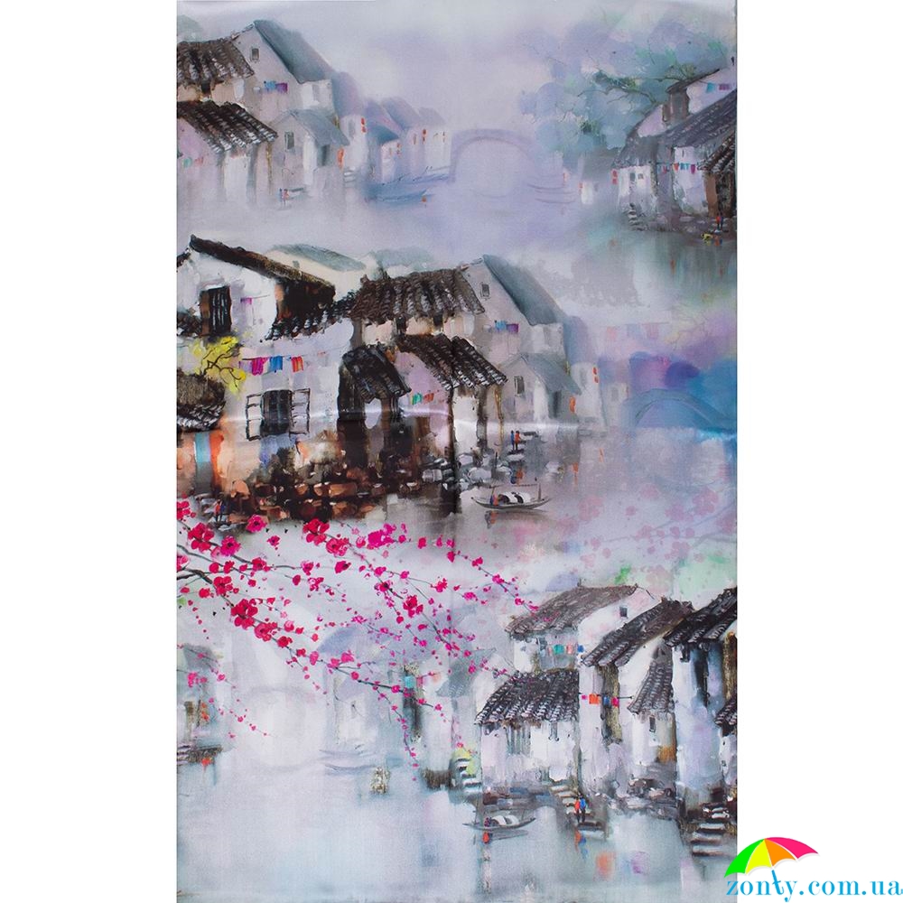 Шелковая ткань чаще всего вызывает ассоциации с Востоком, ведь именно оттуда она пришла в наши страны. Хорошо, когда и характер принта на изделиях из шелка передает восточный колорит или традиции в искусстве, - так как это видим мы на аксессуаре производства торговой марки ETERNO. Сине-голубые размытые тона, как легкий туман у воды, окутывает домики мягким маревом, они проступают сквозь него черепичными крышами и белеными стенами, маленькими цветными точками отдельных деталей. И вот - яркий акцент в виде ярко-розовой цветущей ветви на первом плане, тонкое указание на то, что художник из Азии изобразил именно весенний пейзаж. Для женского образа такой шарф станет универсальным дополнением гардероба, поскольку гамма оттенков здесь деликатная и разносторонняя. Купить аксессуар из натурального шелка можно по выгодной цене, которую предлагает наш магазин.