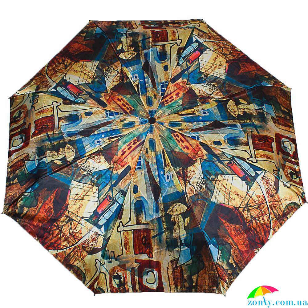Пятна коричневого, охристого, светло-желтого и сине-голубого смешались на куполе этого зонта словно перемешанные и раздробленные части одной картины. Скаты крыш, силуэты прохожих, арки и окна – все образует невероятный хаос, который при этом поражает гармоничностью и законченностью. Дизайнерам удалось найти тонкое равновесие между разнородными цветовыми акцентами, деталями и эффектными изломами. В результате композиция выглядит динамично и смело, но при этом аккуратно и не броско. Однозначно, такой аксессуар займет отдельное место в каждом костюме, ведь на него сложно не обратить внимание. Сдержанная гамма и преобладание коричневых тонов позволят выгодно сочетать его с разными элементами гардероба, в первую очередь – однотонными куртками, плащами и пальто, которые являются самой распространённой одеждой для ненастного времени. Купить такой зонт по скромной цене можно в нашем магазине.